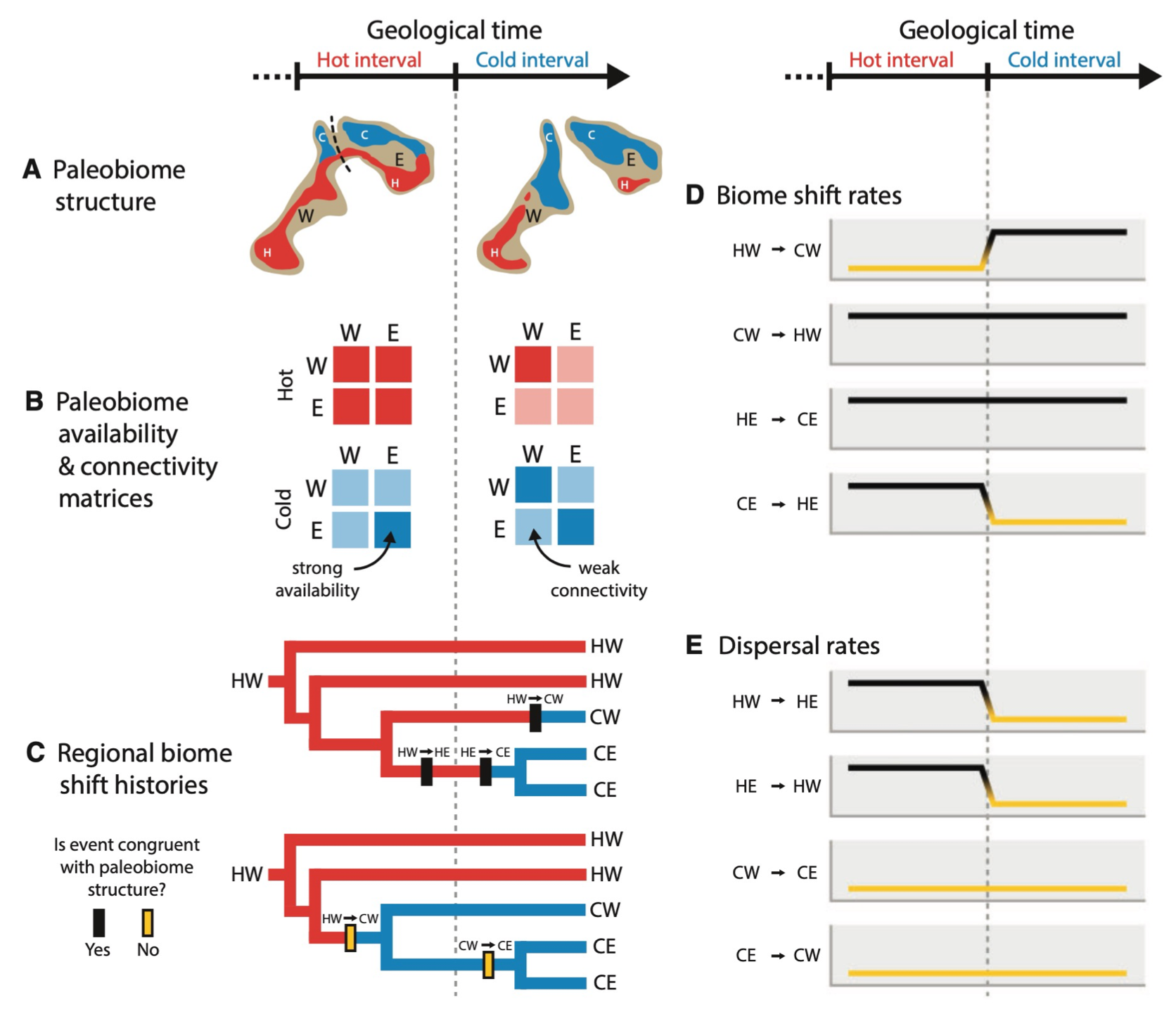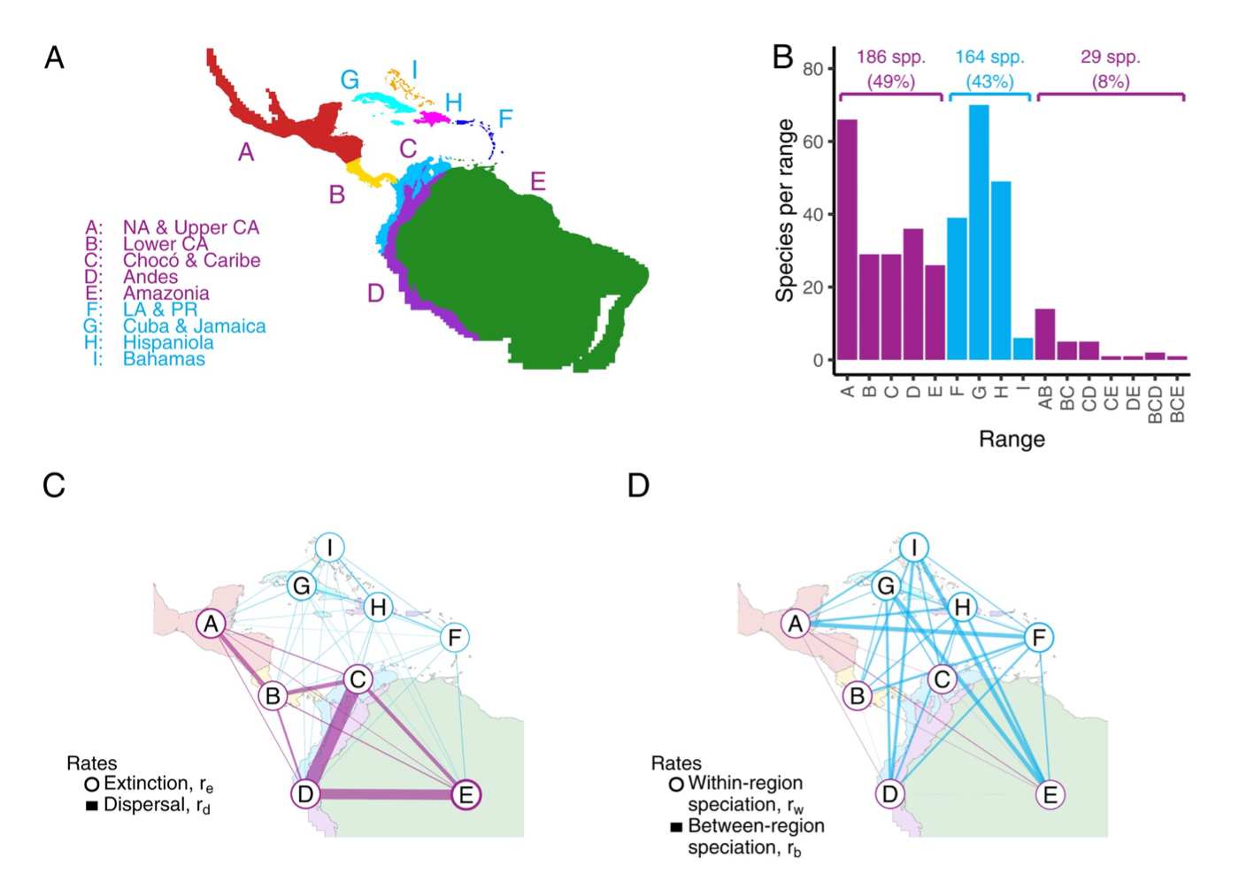 - New study now published in PNAS, modeling how regional features of geography (e.g. oceans, distances) influence speciation, extinction, and dispersal rates. Read more here and here.